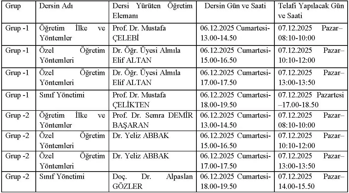 06 Aralık 2025 tarihinde Fakültemizde yapılacak olan Anadolu Üniversitesi Açıköğretim Fakültesi sınavları sebebiyle 06 Aralık 2025 Cumartesi günü öğleden sonra yapılması gereken Pedagojik Formasyon derslerinin aşağıda belirtilen tablodaki belirtilen gün ve saatte yapılacaktır. Öğretim elemanlarımızın ve öğrencilerimizin bilgisine…